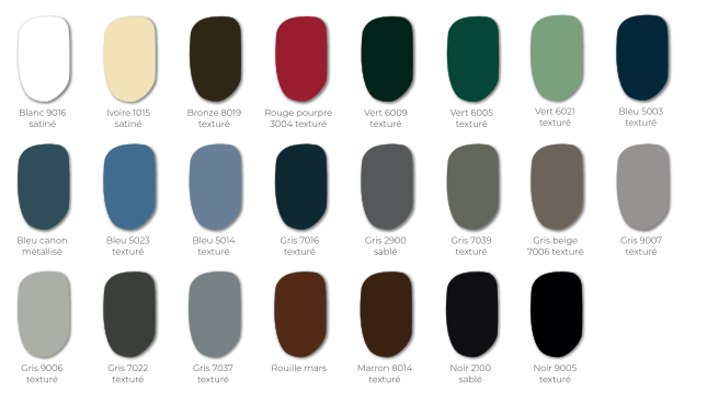 • Couleurs standard sur la structure : blanc satiné 9016, gris texturé 7016, gris texturé 9007, rouille Mars 2525.